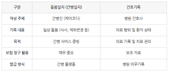 돌봄일지 vs 간호기록 차이점 총정리|간병보험 청구 시 헷갈리는 핵심 비교